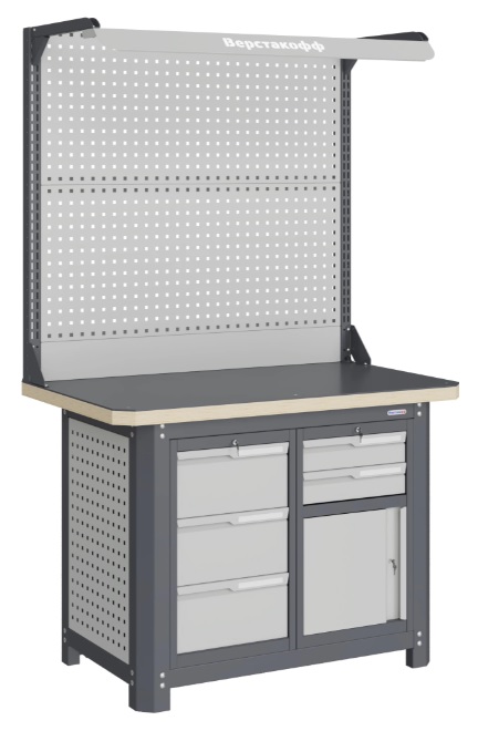 Состоит из столешницы шириной 1193 мм, рамы верстака, состоящей из опор, перемычек, боковых перфопанелей, малого модуля S3, малого модуля S9, двойного экрана с кронштейнами и комплекта освещения.