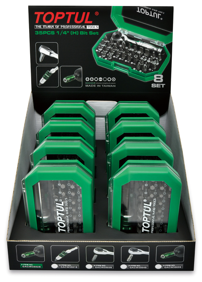 Приобрести Набор бит 1/4" с трещоткой 35 пр. Display Box (8 комплектов) TOPTUL GACW3503S от компании Toptul (Тайвань) из раздела Наборы бит по цене 23 430 рублей.